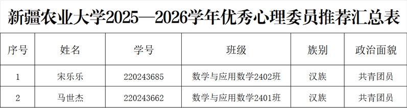根据新疆农业大学《关于开展2025-2026学年优秀心理委员、优秀心协评选工作的通知》要求,按照“公平、公正、公开”的原则,经过本人申请、学院审核、公开竞选与现场评审,现将赌博网站 2025-2026学年优秀心理委员推荐名单及综合情况公示如下。